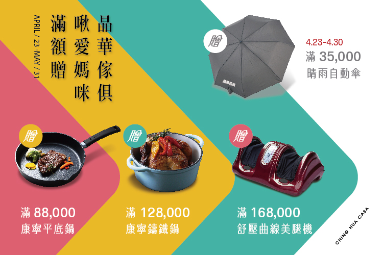 (記者夏咸欽報導)時尚精品沃荷傢俱,主打平價奢華,系列商品針對流行品味趨勢,自行研發出屬於台灣年輕族群喜愛的「高質感」、「中價位」的傢俱,以輕時尚傳達當代都會新生活。晶華傢俱精選出超高CP值全牛皮沙發39800元起,在母親節檔期推出年度優惠滿額禮,滿88000元,送康寧 臻釜鑄造不沾平底鍋、滿128000元,送康寧鑄鐵鍋、滿168000元,送美腿按摩機,於4/30前消費滿35000元,加送自動傘一只來體恤全天下孝順媽媽以及子女們。