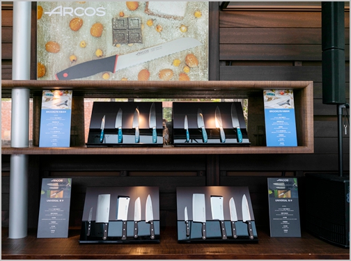 ARCOS阿科斯品牌上市發表會上,展示三大系列 - BROOKLYN布魯克林、UNIVERSAL寰宇、DÚO杜爾全品項產品,包含主廚刀、三德刀、蔬果刀、中式菜刀、剁刀和麵包刀等等,同時也邀請五星級飯店專業主廚於現場親身演繹精湛刀工,獨到分享在料理西班牙火腿、日本壽司和西式牛排時,特別重視刀具的品質。ARCOS阿科斯獨家NITRUM®不鏽鋼刀片的超高強度、硬度和耐磨特性,大幅提升料理的細緻度。而ARCOS阿科斯刀具皆為西班牙原產,每個製作環節致力達成環境永續目標,不僅取得ISO與NSF等品質及安全認證,也深受國際設計獎項的肯定,成為熱銷全球70多國的專業刀具品牌。精湛工藝品質保證,多款優質作品被西班牙國家歷史博物館納入收藏,可謂國家級最高榮譽的第一把刀刃,更是許多世界米其林名廚的必備利器。