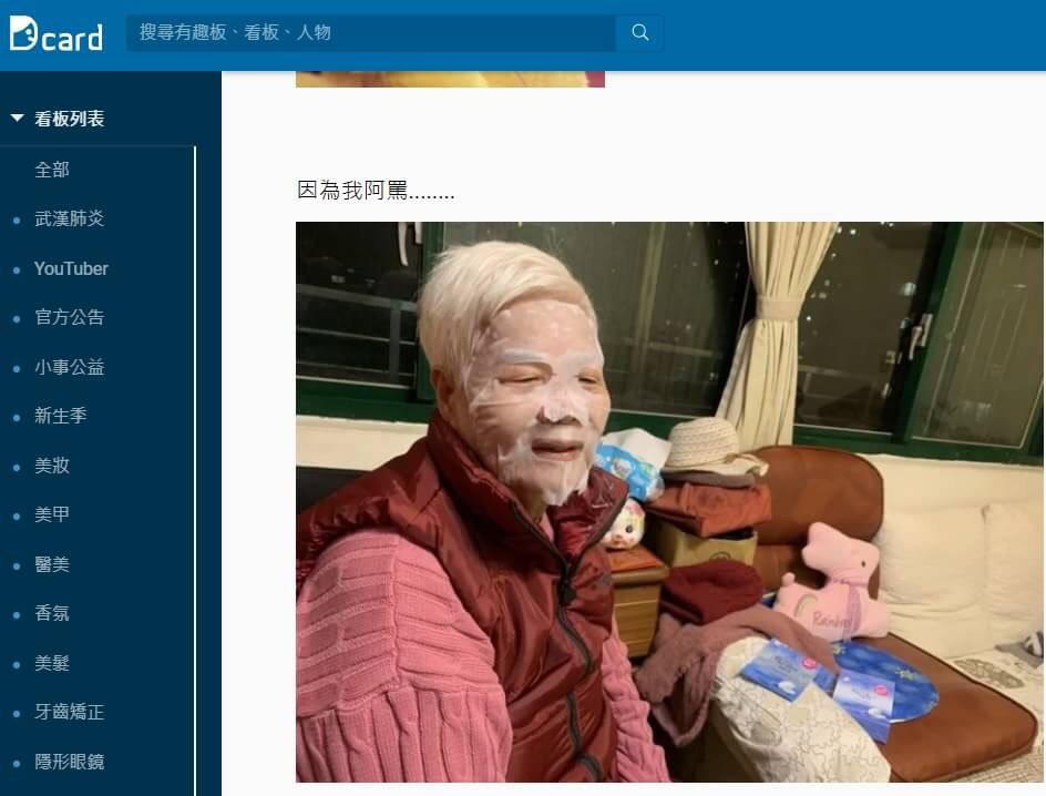 此文在網路論壇Dcard才一PO出,就引起底下網友熱烈討論,阿嬤名字剛好也叫「王美」,網友笑稱「阿嬤真的貨真價實網美一枚」、「標題:我的ㄨㄤˊㄇㄟˇ阿嬤」,更有眼尖的網友發現「那個包裝應該是專科面膜吧哈哈哈 阿罵好可愛~~」,沒想到連網美阿嬤都風靡於網路論壇。