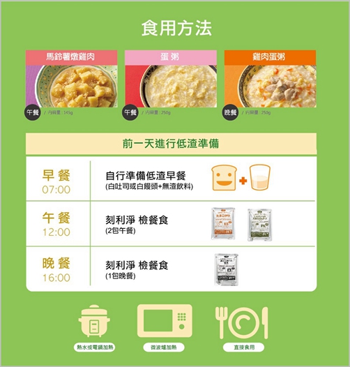 來自日本原裝進口的「刻利淨檢餐食」,已獲得全國超過百家大型醫療院所採用。「刻利淨檢餐食」專業低渣飲控,輕鬆解決受檢者低渣飲食的困擾,不再擔心害怕吃錯食物影響檢查結果,豐富多元的口感,讓檢查前準備更輕鬆,口味有蛋粥、馬鈴薯燉雞肉及雞肉蛋粥,另外特別推出加了鮭魚粥的升級版套組,只要簡單微波或隔水加熱,就能享受到美味又簡便的三餐。