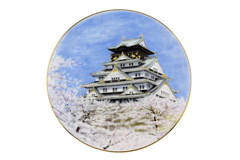 ◇ 手繪天守閣 盤 36cm 定價$368,000畫師透過細膩筆觸,以寫實手法描繪天守閣,巧妙運用瓷器的溫潤,襯托建築本體的潔白,手繪畫工展露無疑,搭配庭園中熱情綻放的春櫻,以四季變化迎接未來榮景。