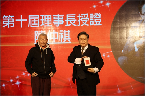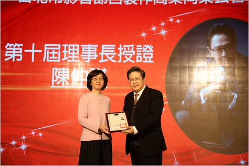圖:文化部影視及流行音樂產業局高明秀副局長(左)為第十屆理事長當選人陳仲祺(右)進行授證,頒發當選證書。