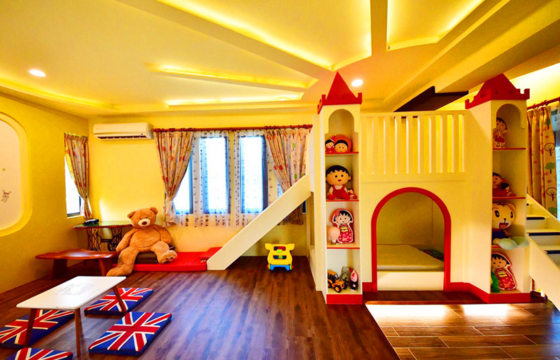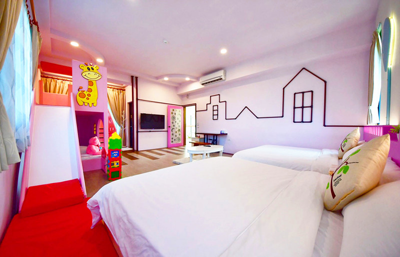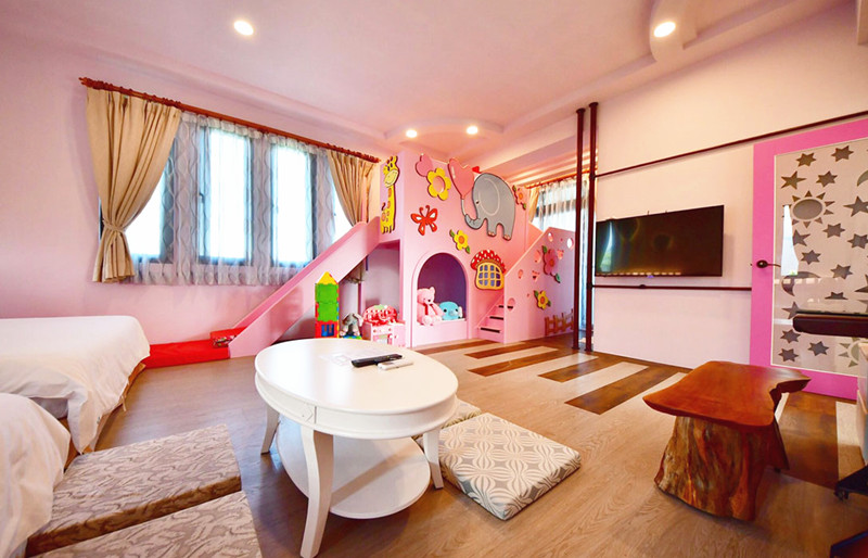 在童趣風四人房裡,可愛夢幻親子主臥室以暖色系的粉紅色做為空間色調,搭配舒適的寢具和五彩繽紛的壁貼裝飾,供給親子靜心駐足的寧謐氛圍。大型溜滑梯、兒童遊戲設施,讓親子互動更加甜蜜溫馨。最特別的是業者貼心提供軟水機的軟水系統過濾雜質。超大浴缸讓親子同樂浸泡其中,水質宛如化妝水般的滋潤保濕,還能增添美膚及髮絲滑順,同時重新喚起一天的活力。