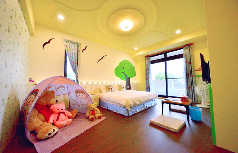 「花彤林」主題式房型有5間精緻客房共可容納12~14人。太陽之星四人房、城市雙人房,童趣風四人房、森林雙人房、和風雙人房。每一間房型都有不同設計風格與巧思,寬敞舒適主臥空間與加大型浴缸,滿足了旅人們疲憊的心。打開室外窗景山巒疊翠與田園風情一覽無遺,自然光源灑落更顯得整間客房朝氣明亮。