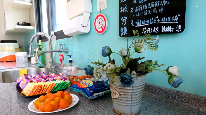 走進屋內,客廳以知名卡通櫻桃小丸子為設計概念,象徵著天真、無邪的童趣氣息。業者以親切、貼心、不叨擾的服務品質,提供旅人們歇腳、談趣、歡唱的溫馨空間。廚房設備樣樣俱全,咖啡、茶包、泡麵、零食、水果等,還可以自在享受與親朋好友歡聚優閒的大好時光。