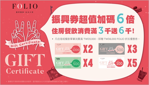 Folio Hotel幫您省荷包,把振興券三倍變六倍! 每人可用TWD1,000換TWD3,000振興券,使用TWD3,000振興券消費即贈FOLIO優惠折價券TWD6,000,只要花TWD1000即可享價值TWD6,000的超值優惠!