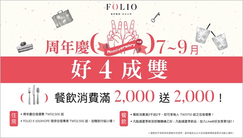 周年慶國人住宿 & FOLIO X 1010HOPE 環保住宿優惠 皆TWD2,500起
