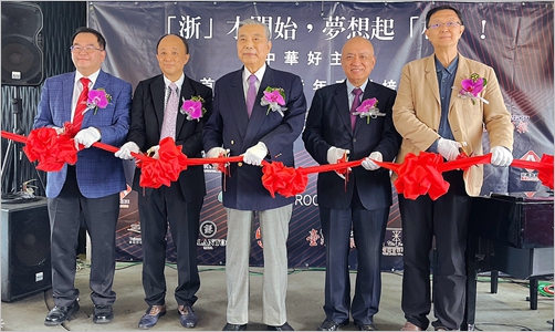 圖說:(左起)海峽兩岸經貿文化交流協會秘書長鄧岱賢秘書長、台灣電商大聯盟執行長暨大朝機構林湘評董事長、兩岸企業家峰會文創與現代服務業小組召集人王志剛董事長、兩岸企業家峰會文創與現代服務業小組副召集人鄭家鐘董事長、東森電視集團張璠副董事長共同為「中華好主播」首屆兩岸青年主播培訓營發佈會剪綵。