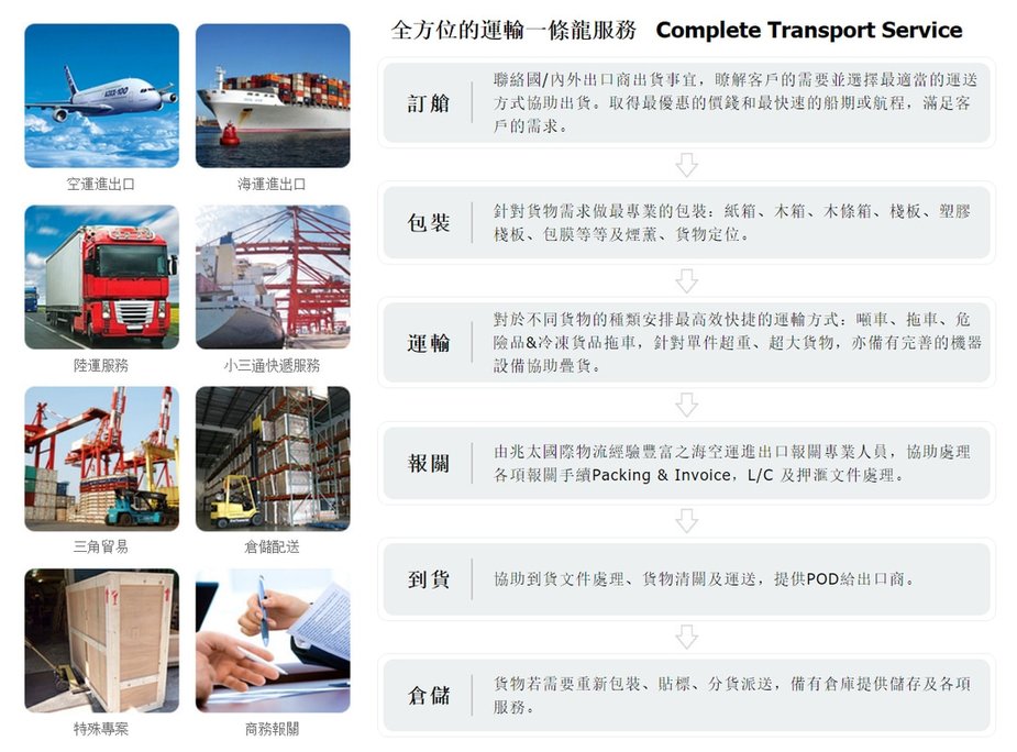 兆太國際物流專門處理全球性之貨物(櫃)運輸,致力於海運和空運進出口、快遞及三角運輸服務,近年來更協助台灣客戶解決辦理食品、化妝品三證問題。