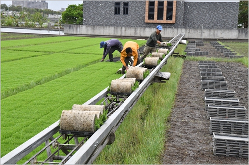 ▲初春季節,栽種夢田越光米的農民們正在捲央苗準備插秧。(圖/五結鄉農會提供)