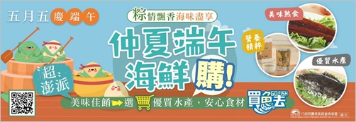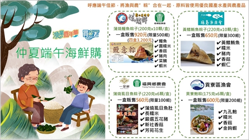 漁業署表示,為了讓消費者見識國產水產品的不同風貌,本次特別媒合漁會及農會共同合作,以優質國產農產品製作端午限定水產粽,包括以東北角養殖的貢寮鮑整顆包入內餡象徵著好運包中,每一口都吃的到大海賞賜豐饒海味,由貢寮區漁會推出的「貢寮鮑粽」;彰化區漁會與梧棲區農會攜手推出,以肉質細嫩鮮美的鰻魚搭配甜鹹醬汁及國產內餡食材的「鰻意粽」;還有採用福興鄉自產長糯米,搭配南臺灣養殖虱目魚、嚴選五花豬等國產食材,由茄萣區農會及福興鄉農會聯合推出的「蒲燒虱目魚粽」;綠島區漁會採用當地捕獲的黃鰭鮪,加上豬肉做搭配,鹹香的調味裹以當地月桃葉,煮熟後充滿獨特香氣,令人食指大動的「黃鰭鮪魚粽」,四款海味特色粽子,都可在漁業嘉年華─仲夏端午海鮮購上預購,今年端午想吃粽,只要在家動動手指,就能來點海味滿滿的特色水產粽,數量有限,千萬不要錯過。