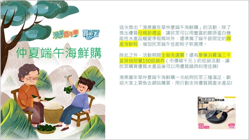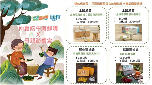 漁業署表示,本次檔期除了海味粽,還有方便料理的三清產品及魚精、膠原蛋白吸凍飲等「喝的保養品」、一口即食烏魚子禮盒等,皆是寵愛媽咪、佳節送禮的好選擇。活動自即日起至6月30日止,活動期間全站免運費,單筆消費滿3,000元還可抽鍋具(限量150組),優惠組合數量有限,售完為止,更多優惠資訊可上漁業嘉年華網站(https://www.gofish.com.tw/)查詢。