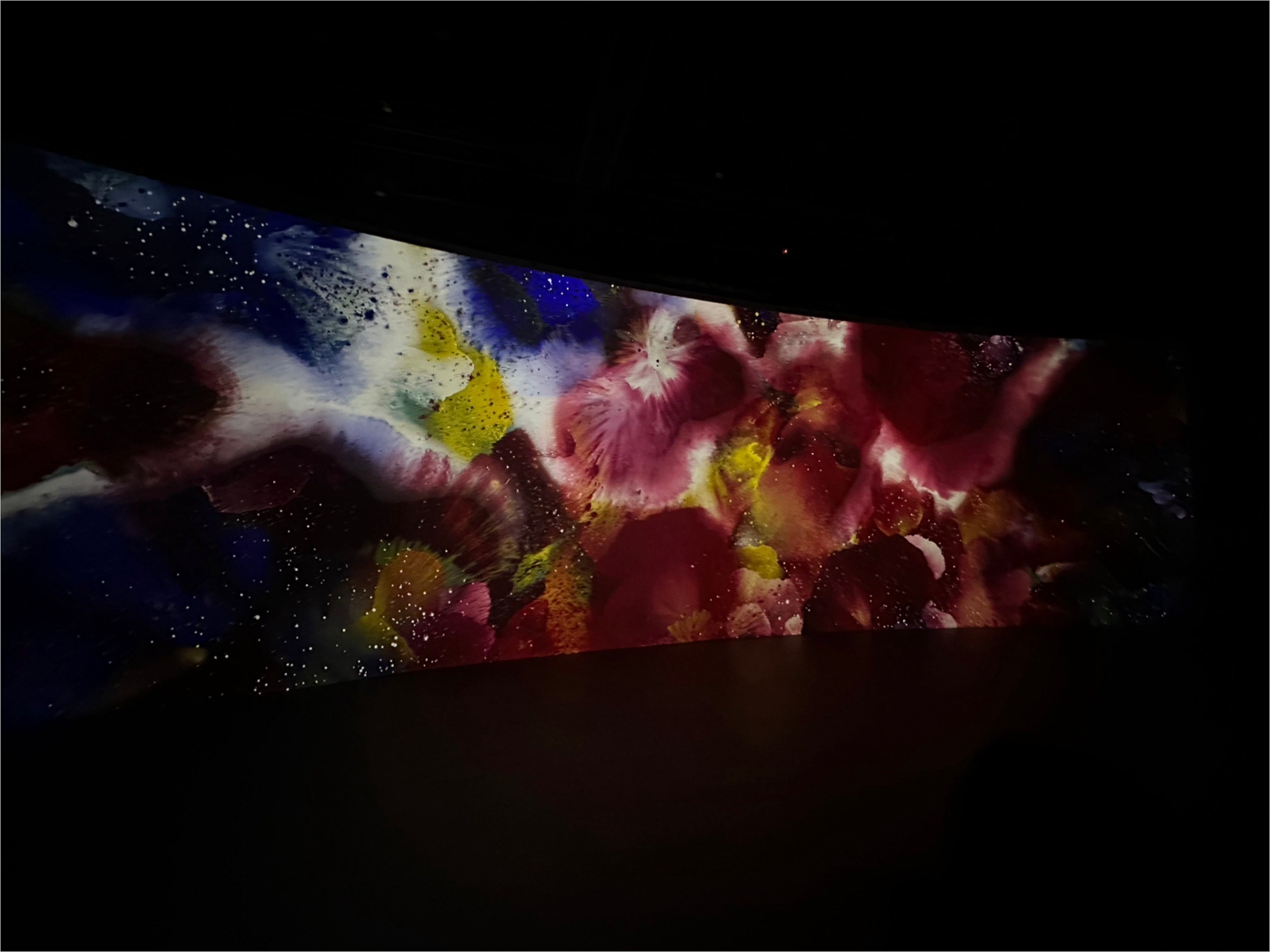 第二展區「數位冥想」由七組國內頂尖新媒體設計團隊共同創作,以「光」與「色彩」為出發點,提煉出九個主題段落。利用五維空間、動態捕捉、AI等數位軟體,展示江賢二作品的藝術內涵,並回應江賢二對藝術和人生理想的追求。音律也融入其中,為展覽空間帶來繽紛絢麗的色彩。