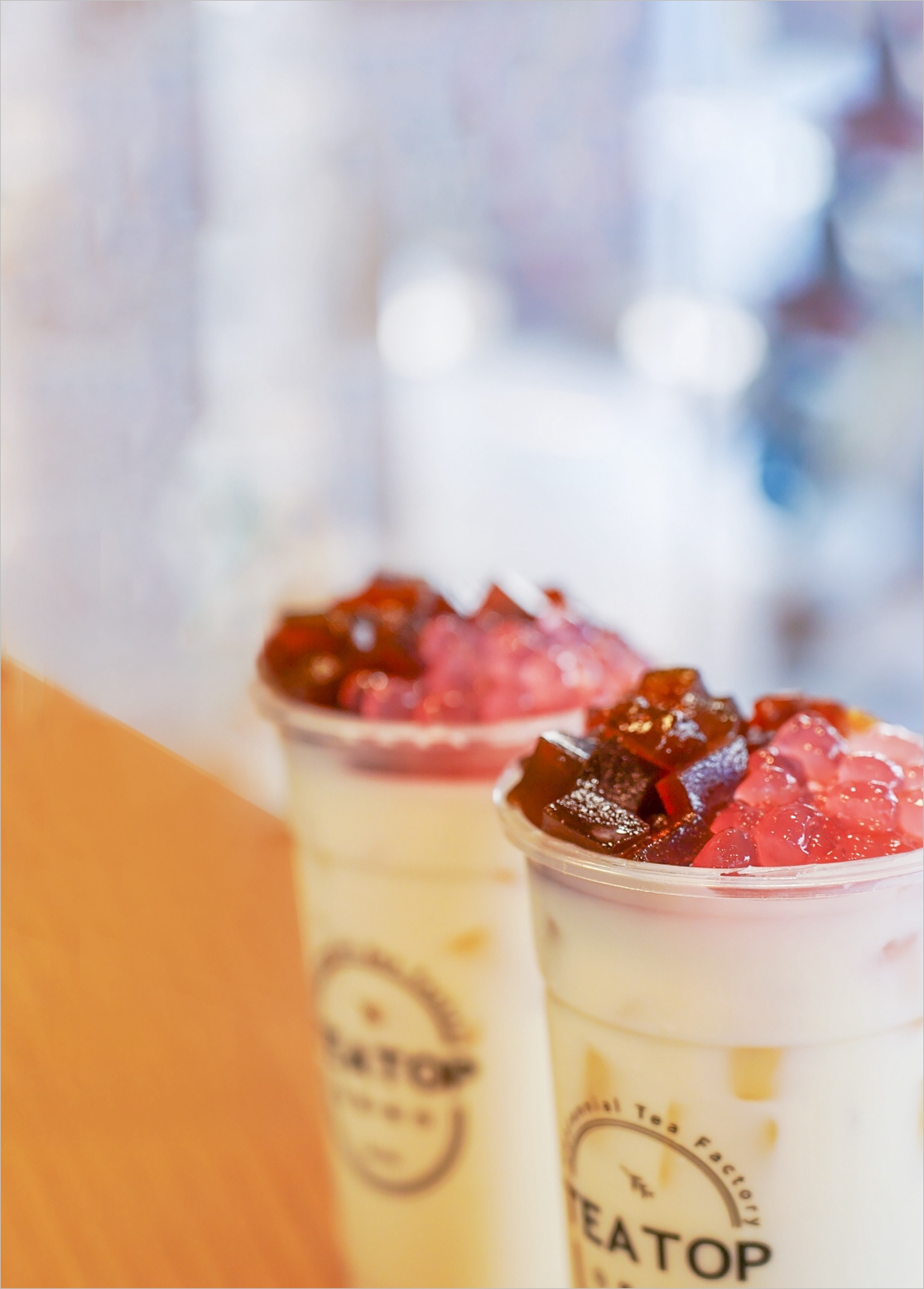 搭配3月限定販售的夢幻粉嫩櫻花寒天晶球,帶有櫻花香氣,Q彈口感在口中爆開的滋味讓人著迷;另外還加有口感Q彈滑順的台灣傳統夜市小吃配料「紅玉粉粿」,以日月潭台茶18號作為基底,完美比例調製,每日新鮮現做的紅玉粉粿吃起來Q嫩爽口,咬得到清茶香,一杯就能體現奶茶與配料的完美融合,成了時下最夯的手搖飲飲料,只有在《TEA TOP第一味》喝得到。