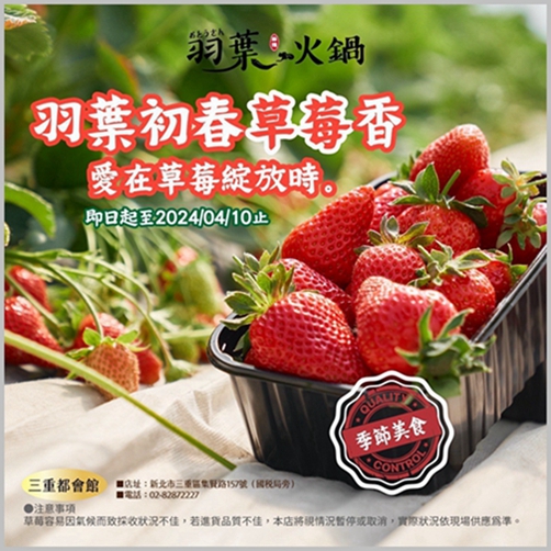 「羽葉麻辣火鍋」廚藝團隊精心炮製,全天候供應上百道料理及搭配口感到位的十多款精髓火鍋湯底,並精挑細選新鮮食材。此外,更引入了新菜「酸菜魚」,這道菜色源自重慶,融合了鮮美的魚肉和香辣的酸菜,再搭配特製的湯底,口感豐富多樣,令人愛不釋手。無論您是偏愛麻辣風味還是酸辣口感,「羽葉麻辣火鍋」都能滿足您的味蕾需求。除了精選的日本及澳洲和牛火鍋,還能品嘗頂級海鮮食材「阿根廷天使紅蝦」、「黑虎大草蝦」、「日本生干貝」、「牡蠣」、「特選松阪豬」「生蠔清肉」、「奶油腰子貝」、「紹興大蝦」、「三點蟹」、「鰻魚壽司」三重店限定、「生魚片」台中店限定。除此之外,即日起至4月10日止再加碼推出「草莓季」吃到飽活動,讓您在火鍋盛宴後,品味清新甜蜜的草莓滋味。