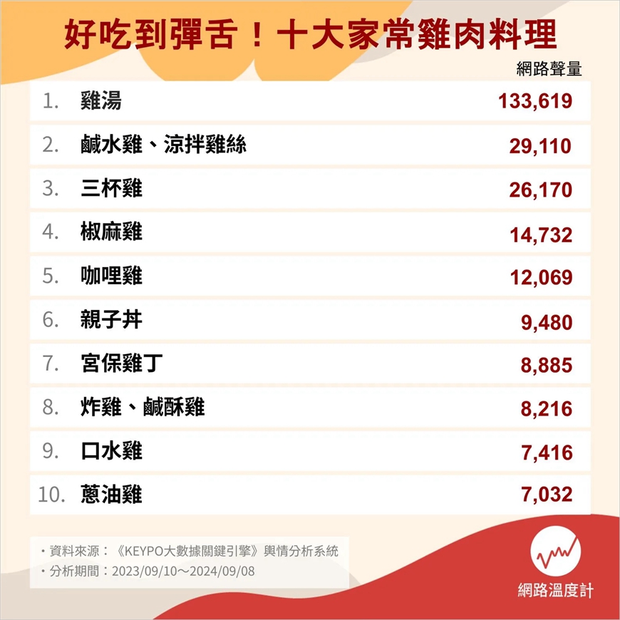 《網路溫度計DailyView》透過《KEYPO大數據關鍵引擎》輿情分析系統,盤點網友常討論的「十大人氣家常雞肉料理」,有哪些烹調快速方便又色香味俱全的菜色,讓需要照顧小孩與長輩的煮夫煮婦,在家也能輕鬆端出美味佳餚呢?趕快筆記起來,準備上菜啦!